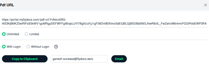 | 9. We have two more options to secure the generated URL. 1. With Login: The receiver needs to have a login of FLYdocs to access the URL. 2. Without Login: The URL will be accessible without any need of logging into FLYdocs. |