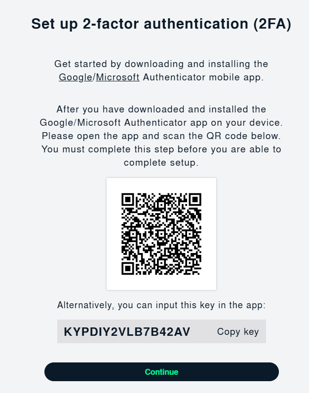 | 3. For first-time users below screen will appear which will have a code, either the user can use a code or QR code available to add an account in Google Authenticator or Microsoft Authenticator. | ![]() |