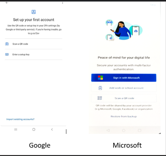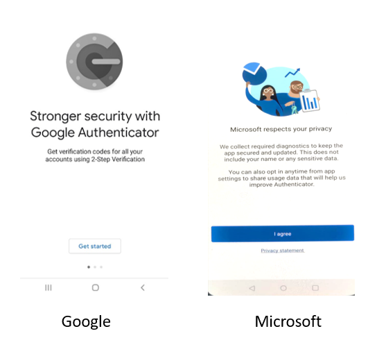 | 4. Download the Authenticator applications below - 1) �Google Authenticator: install it on your handheld device. Click on "Get Started". OR 2) Microsoft Authenticator: install it on your handheld device. Click on "I Agree" |