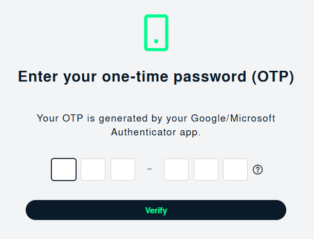| 6. Click on CONTINUE in Step 3, a new page will open where the user can enter verification OTP. Note: Enter the code generated in Google Authenticator OR Microsoft Authentication Application in the OTP field. After verification, the site can be accessed. "Ensure you submit the current OTP because it refreshes every 30 seconds." |