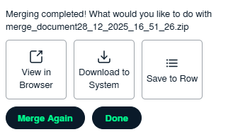 11. After selecting merge option you will get three option. 1. View in Browser 2. Download to system 3. Save to Row Select the required option and click on Save. |