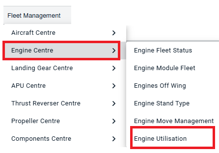 | 2. Hover over the Fleet Management tab then Hover over the Engine Centre tab and Click on Engine Utilisation tab. It will open Engine Utilisation page in a new window. | ![]() |