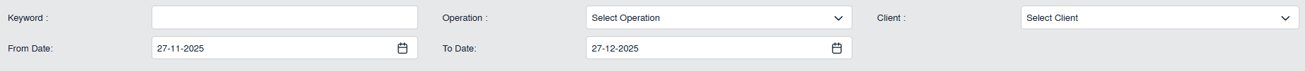 | 6. Select filter types to filter Audit Trail Report. Like filter by keyword, filter by operations, filter by date, filter by client etc. | |