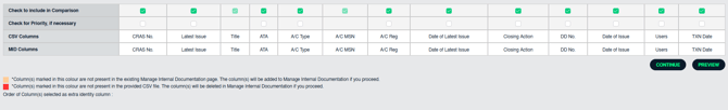 | 10. It will show you columns selected for comparison in the grid. At the right side, Click on CONTINUE or PREVIEW button. Notes: If you click on PREVIEW button, it will download the compared file, so that you can check the changes. |