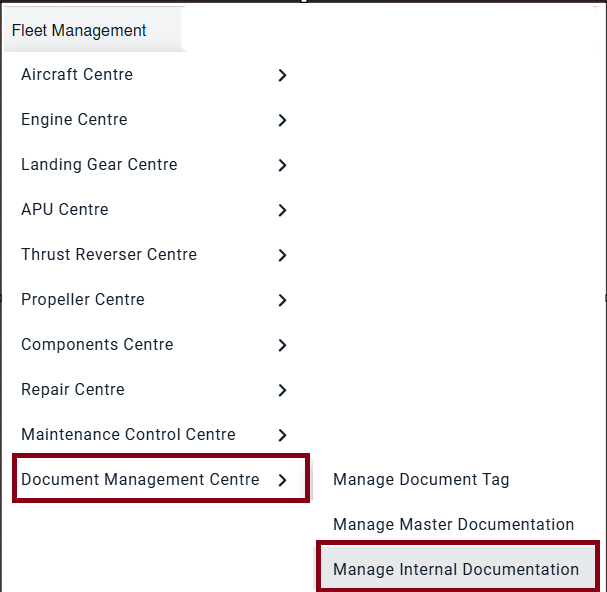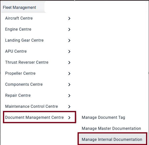 | 2. Hover over the Fleet Management tab. Hover Over Document management Centre tab and Select Manage Internal documentation tab. | ![]() |